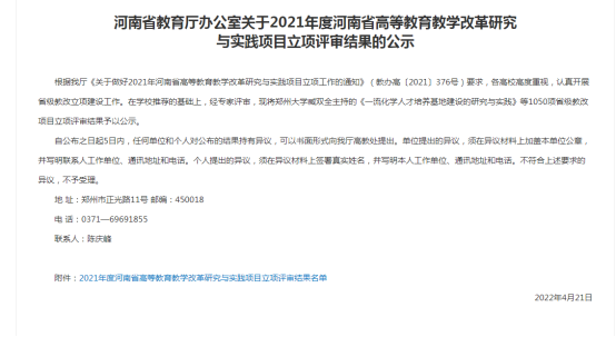 近日,从河南省教育厅官方网站获悉,在学校推荐的基础上,经专家评审,2021年度河南省高等教育教学改革研究与实践项目立项评审结果公示,马院1个项目获得立项。