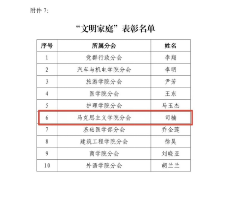 被评为“文明教师”,司楠教师家庭被评为“文明家庭”。