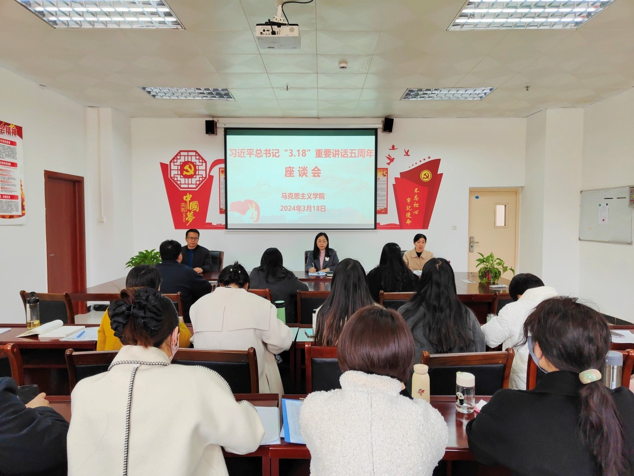 座谈会上,祁欢回顾了马院成立以来的发展、思政课建设情况,总结了马院学习贯彻习近平总书记“3.18”重要讲话精神,扎实推进思政课教学改革创新取得的一系列成绩;对继续深入领会讲话精神,谋划好马院下一步发展提出明确要求。党支部书记郑玉秀指出,要以习近平总书记发表“3.18”重要讲话五周年为契机,紧跟新时代大学生思想政治工作新形势,积极探索思政课教育改革发展,切实提高思政课教育教学质量。副院长柯涛提出,要按照“建精品在线课程促提升”的工作思路推动思政课改革创新,持续提升思政课程育人质效。“毛泽东思想和中国特色社会主义理论体系概论”教研室主任曹涌结合自身的教学科研工作,以《全面落实习近平总书记“3.18”讲话精神,搞好<毛泽东思想和中国特色社会主义理论体系概论>课程教学》为题,就落实思政课建设的“八个相统一”要求作交流发言。“思想道德与法治”教研室主任陈峰以《发挥教师主体作用 推动思政课改革创新》为题,分享了自己将新理念引入思政课教学的心得体会。青年教师肖园丽分享了参加省高校思想政治理论课教学技能“大比武”活动的有益经验,号召大家在日常教学中努力打造思政“金课”。