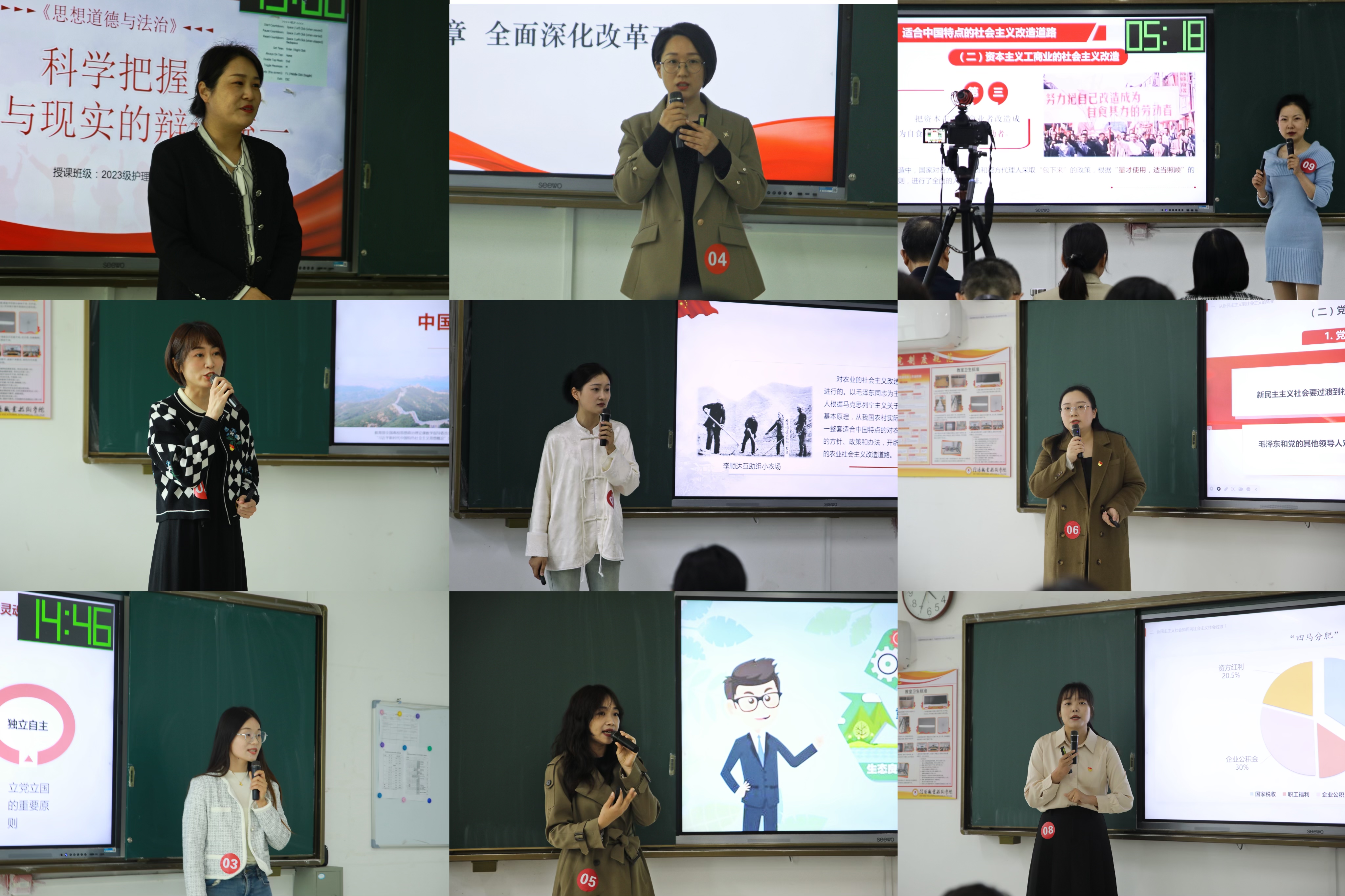 活动环节,经过beat365正版唯一官网初赛遴选出的9名选手,围绕《习近平新时代中国特色社会主义思想概论》《毛泽东思想和中国特色社会主义理论体系概论》《思想道德与法治》《形势与政策》四门课程,按照抽签的先后顺序,结合PPT,进行了15分钟的现场无生教学展示。选手们用饱满的热情、创新的设计、详实的讲解,充分展示出深厚的理论功底和扎实的教学技能。