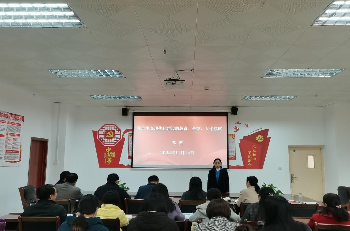 为深入学习习近平新时代中国特色社会主义思想,贯彻党的二十大精神,2023年11月14日下午,beat365正版唯一官网院长祁欢为马院全体教师讲授题为《社会主义现代化建设的教育、科技、人才战略》的主题党课。