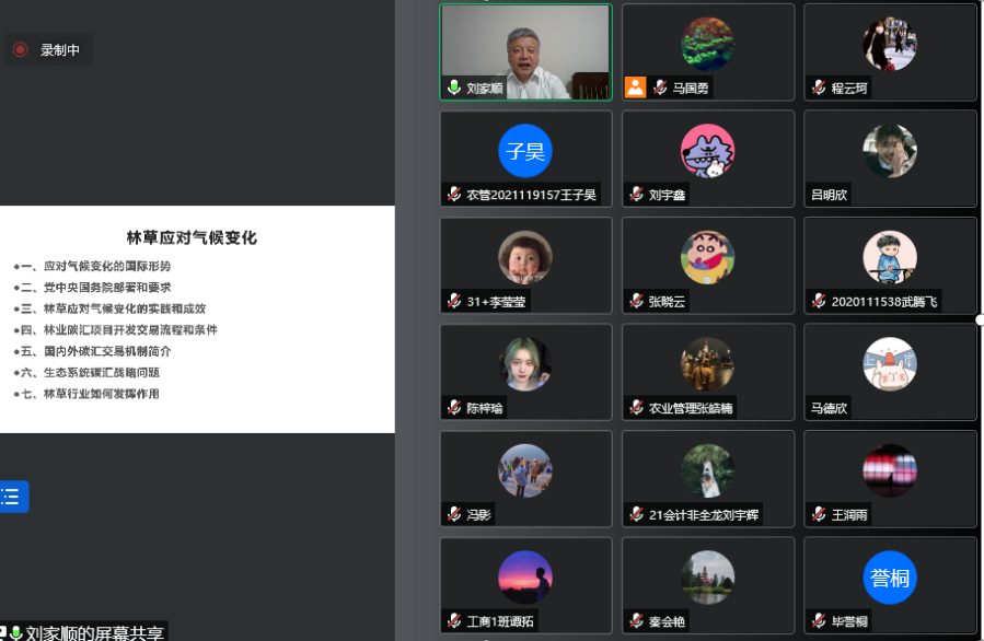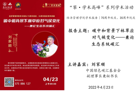 4月23日上午,3003新葡平台登录入口通过腾讯会议,借助云端成功举办了迎接建校70周年华诞之“攀·学术高峰”系列学术活动的学术报告。报告人为学院1985届林业经济专业校友刘家顺,现任国家林业和草原局一级巡视员、中国绿色碳汇基金会副理事长兼秘书长。