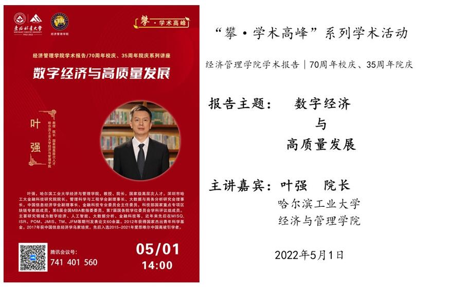 2022年5月1日下午,3003新葡平台登录入口通过腾讯会议,借助云端成功举办了迎接建校70周年华诞之“攀·学术高峰”系列学术活动的学术报告。报告人为哈尔滨工业大学经济与管理学院院长叶强,现任管理科学与工程学会副理事长、大数据与商务分析研究会理事长、中国信息经济学会副理事长。