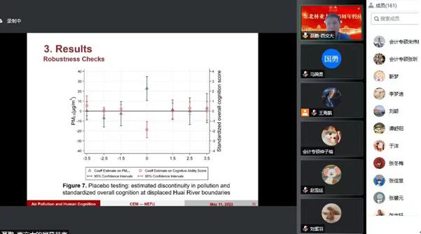 聂鹏以《空气污染对人类认知的长期影响》为题,从“世界空气质量情况”、“精神健康的重要性”、“PM2.5对人类健康的风险”等方面,详细讲解了其团队开展该课题的原因、背景、意义,并立足实际提出了淘汰燃煤供热系统,用更清洁的能源替代煤炭,增加技术开发的投资,促进教育普及等改进方向。聂鹏老师表示,确定PM2.5对认知能力的长期因果影响面临巨大研究挑战,一方面,空气污染对认知能力的因果关系可能由于居住地不同存在误差;另一方面,与许多其他发展中国家类似,中国的空气污染监测网络近年来才被重视,直到2013年才开始使用地面污染监测仪监测PM2.5浓度。聂鹏老师研究数据来源十分广泛且收集难度较大,主要包括以下渠道:一是中国健康与养老追踪调查;二是社区居民的健康、退休、医疗保健利用、收入和支出、医疗保险状况的评估;三是美国、英国等国家在健康、老龄化和退休方面的相关数据。此外,聂鹏老师指出,任何研究都存在局限性,要时刻关注研究领域最新动态,善于利用相关技术获取更多的研究数据。