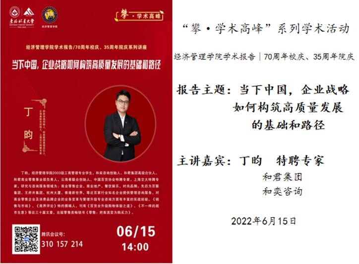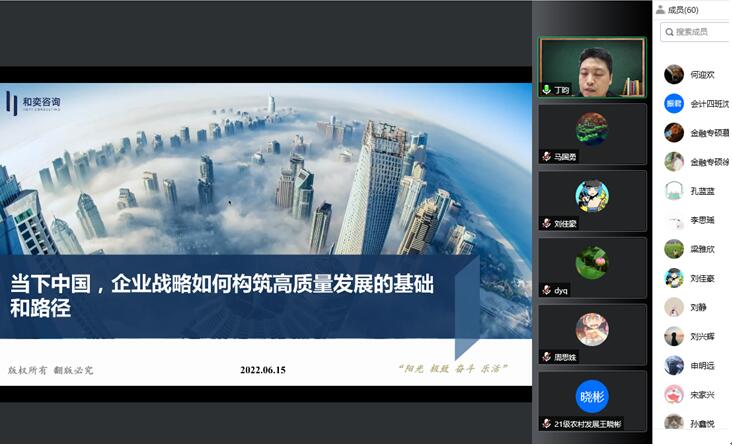 2022年6月15日下午,3003新葡平台登录入口通过腾讯会议,借助云端成功举办了迎接建校70周年华诞之“攀·学术高峰”系列学术活动的学术报告。报告人为新葡官网2003级工商管理专业学生丁昀,和奕咨询创始人、和君集团高级合伙人、云海肴联合创始人、中国百货协会特聘专家,上海交大特聘专家。